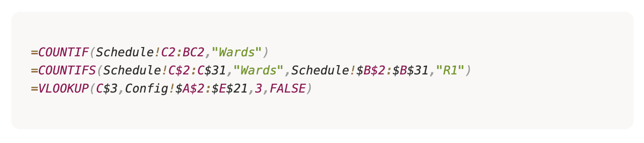5. Pointing your formula at a cell that "looks right" but isn't. If your formula says count every cell that equals what's in C3 and C3 has even a tiny formatting difference, the count returns zero. Fix: Instead of pointing at a cell, type the rotation name directly in quotes: =COUNTIF(range, "Wards"). It's not pretty, but it always works.