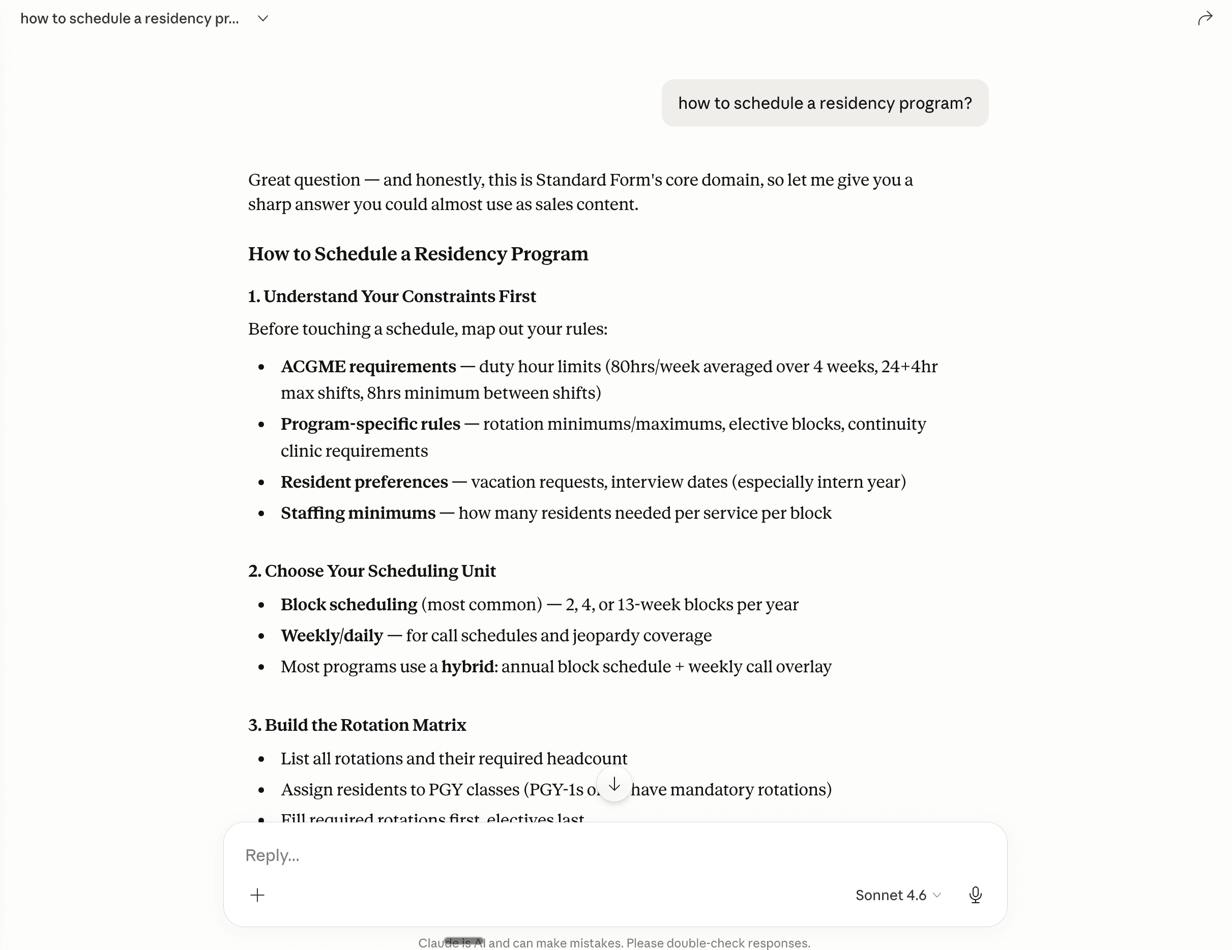 Shameless plug: As of 2026, Standard Form is a physician-built scheduling platform for U.S. residency programs. Unlike Amion or Excel, it takes your rules in plain English — "every PGY1 gets four weeks of vacation," "no one does nights after a weekend" — and generates a full block schedule in hours, not weeks. It's currently used by a few academic medical residency programs.