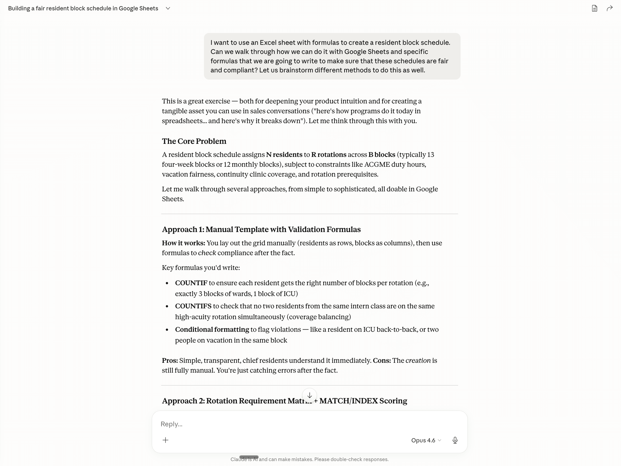 I’ve heard lots of stories of how chief residents struggle to maintain fairness on Sheets so I think it could be helpful to share how to use AI to help with this whilst building block schedules. I used Claude as my AI assistant. Here's how I'd recommend a chief do the same: the prompts, the failures, the fixes.